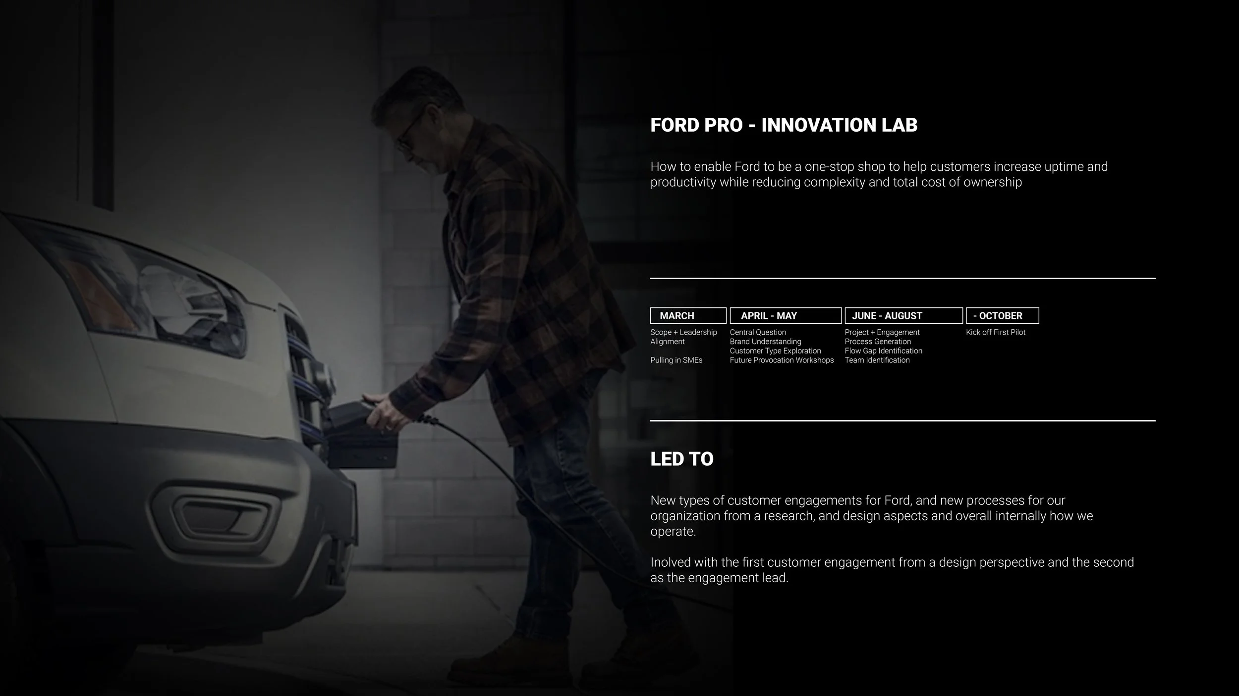 Development of a new customer-facing organization of “Ford Pro” which was released earlier this year. Investigating how we approach customers, types of engagements, outcomes and new processes for not just our team, but the integration of many teams together.